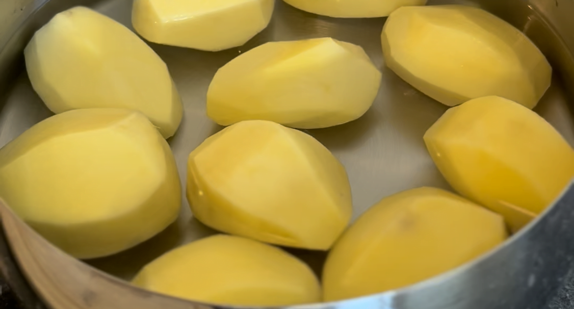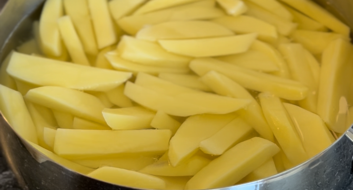 3. Laat de aardappel frietjes 5-10 minuten weken in een pan met water. Voeg zout toe aan de pan en breng de aardappel frietjes aan de kook (met het deksel op de pan) voor 10 minuten. Giet het water af. Dep eventueel de aardappelen iets droger met keukenpapier.