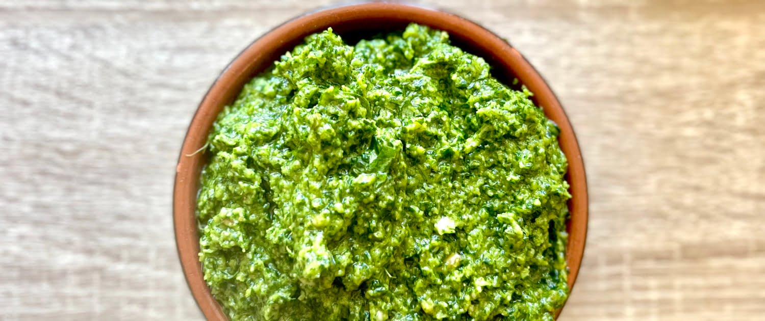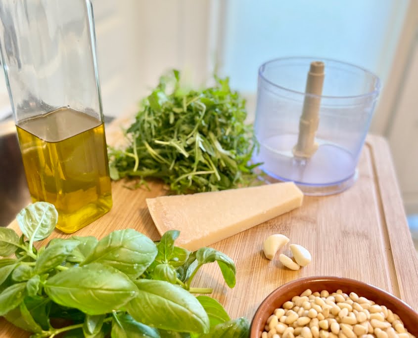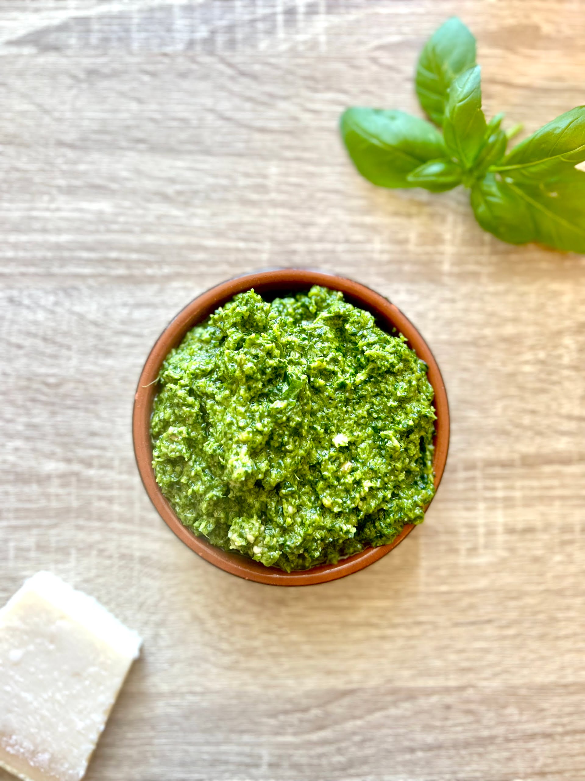 Deze variant met basilicum en rucola is net iets pittiger dan de klassieke pesto, perfect voor een zomerse pasta of als smeersel op een stukje brood.